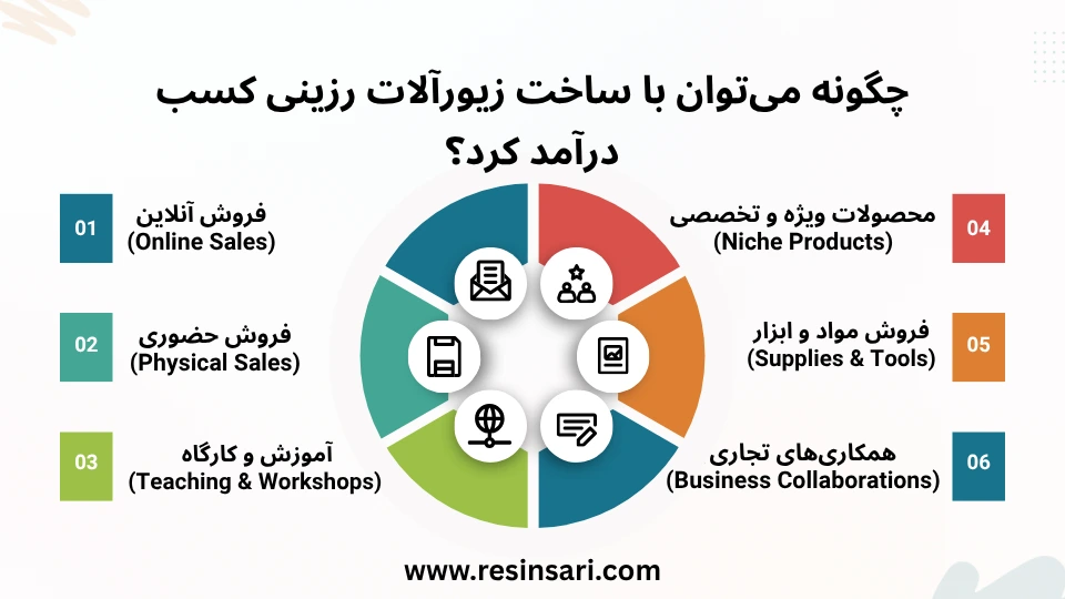 دریافت سفارشهای شخصی برای جشنها، هدایای سازمانی و مناسبتهای خاص نیز میتواند سودآور باشد. در ساخت زیورآلات رزینی برای فروش حضوری، بستهبندی زیبا، داشتن کارت ویزیت حرفهای و ایجاد تجربه خوب برای مشتری اهمیت زیادی دارد و باعث میشود مشتریان شما را به دیگران معرفی کنند.